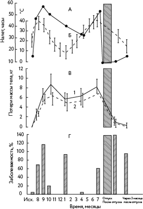 Заболеваемость летчиков, хотя имела несколько иную динамику, в целом отражала характер изменения функционального их состояния. В частности, при пиковых значениях снижения массы отмечалась более низкая заболеваемость, которая имела более высокие цифры в первые два месяца и при снижении летной, нервно-психической и климатической нагрузок к январю, а также в первые четыре месяца после возвращения к основному месту базирования. В данном случае отношения между рассматриваемыми показателями являются более сложными и определяются различиями в степени напряжения функциональных систем организма в наблюдаемые периоды.