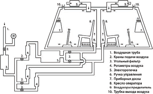 Система кондиционирования воздуха, подаваемого на вентиляцию подкостюмного и подшлемного пространства, состояла из набора резиновых трубок 15 мм, соединенных с ротаметрами и регулировочными вентилями с помощью разъемных муфт. Горячая вентиляционная магистраль представляла собой трубку длиной 10 м, намотанную на барабан 0,2 м и помещенную в кабину стенда. Варьируя длину трубки, сматываемой с барабана и выводимой за пределы камеры, можно было изменять температуру подаваемого воздуха в пределах от комнатной до 10°С ниже температуры воздуха в камере.