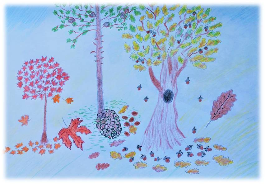 А как же остальные деревья, спросите вы. Давайте посмотрим. Вот невысокая рябина с листьями в форме тонких и вытянутых пальцев прячет алые грозди ягод. Плоды горькие на вкус, но очень красивые, как бусы! Берёзы и тополя очень шумные, у них кроны, богатые желтой треугольной, зубчатой или овальной листвой. Ветер в кронах деревьев так и играет: где сорвет лист, а где просто покачает, пошумит. Хвойные исполины не шумят, зато шишками кидаются: то помощники Серого Леха – не любят гостей. Животные к таким соснам близко не подходили, если и цепляли шишку, то ту, что падала подальше от дерева. А смелые белки умудрялись ещё и запасы делать. Красиво в лесу осенью!