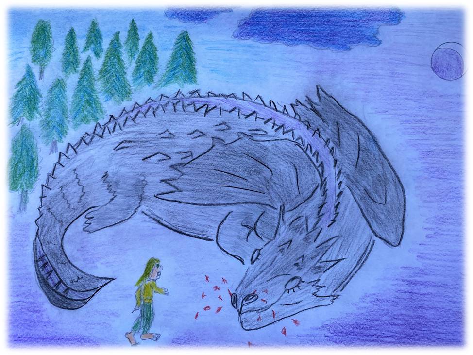 Леший не сразу заметил в сумраке большое животное. Так бывает! Особенно когда ищешь что-то небольшое, а перед тобой гора… Среди деревьев мирно спал дракон. Он был серого цвета, подобного морскому камню, большой. Приглядевшись, Серый Лех различил крылья и хвост. Очень тихо леший подобрался поближе. Ого! Морда у животного была большой и страшной. Глаза закрыты. Из ноздрей при каждом выдохе вылетали ярко-красные искры.