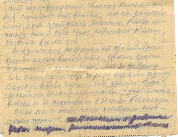 Но и достается же фрицам от Красной Армии кромсали их как бешеных собак, все таки крепкий и выносливый русский воин. вот за все время боев наши части еще ни разу не давали фрицу спуску, а были случаи, что дрались куда с большими силами противника – уничтожали, выбивали и понуждали к бегству без оглядки. Очень много наши части освободили населенных пунктов (далее четыре строки вымараны)