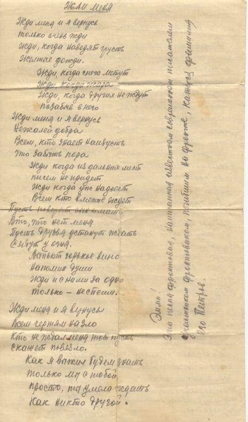 На обороте этого письма стихи, а вдоль них справа сверху-вниз слова: «Эмма! Это песня фронтовая, написанная известным современным писателем участником фронтовиком, погибшем на фронте, кажется фамилия его Петров. ЖДИ МЕНЯ» Далее идет текст стихов, я поместил в таблице слева – текст, присланный папой, справа – оригинал.