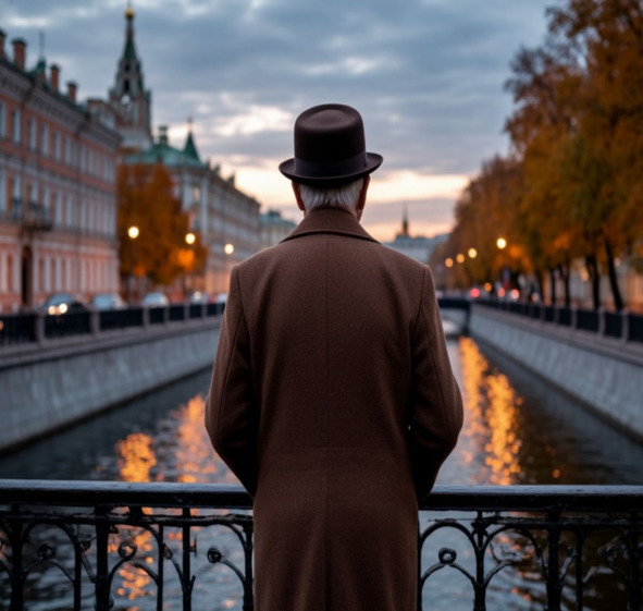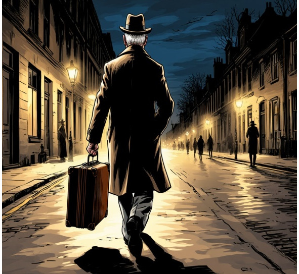 «Однако, мы в Старгороде изрядно наследили и меня могут узнать. А что если загримироваться? Он достал из саквояжа бутафорские бородку и усы, наклеил на лицо и сам себя не узнавая в зеркале подумал: „Типичный Михельсон, теперь меня никто не узнает“. Но затасканное до дыр пальто и затертый и уже бесформенный костюм, не говоря уже, о жуткой шляпе и стоптанных донельзя баронских сапогах никак не подходили к образу делового человека. « Раз уж решился на аферу, то нечего стесняться, надо приодеться, может что-то найдется у вдовушки». Он пошарил по шкафам и нашел отличный английский твидовый костюм, пальто-крылатку, шляпу -котелок и в английском же стиле и полусапоги на шнуровке. Переодевшись и