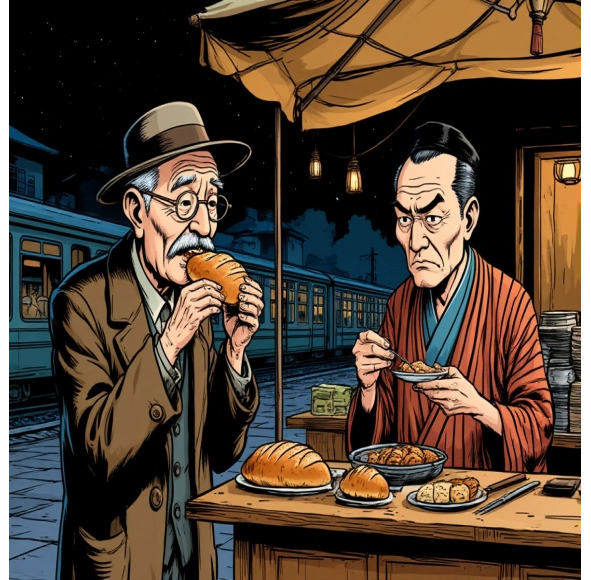 Продавец обрадовался редкому ночному покупателю и стал расхваливать свой товар: «С картошкам – 3, с мясай – 4, с зайцам – 5, всё кароший». Воробьянинов изо всех сил изобразил из себя предводителя дворянства, выпятив грудь и сверкнув глазами сказал: «Ну-ка голубчик, дай на пробу пирожок с зайчатиной, я много куплю, мне в дорогу надо». Торговец оторвал кусочек бумаги от ленты и им прихватив из лотка пирожок подал покупателю. Ипполит откусил немного, пожевал, потом остановился и схватившись за горло и закатив глаза страшно заорал: " Помогите! Отравили! Скорую!» Направив скрюченный палец в лицо побледневшего продавца прокричал: «Убийца! «Испуганный азиат побежал и скрылся в каком-то проёме между дверей здания вокзала. Не теряя времени, жулик открыл саквояж и бросил туда охапку пирожков, тут заметив, что в мелкой картонной коробке на рундуке лежит вся торговая выручка пирожочника, он высыпал все деньги, которые были в основном в монетах, и несколько бумажных купюр, в тот же саквояж. Быстрым шагом Воробьянинов направился к воротам вокзала. Видимо, его вопли о помощи привлекли внимание постовых, так как послышались свистки и топот милиционеров. Поняв, что привлёк ненужное внимание, Ипполит поспешил скрыться в здании вокзала и направился к кассам. Постояв немного в очереди, в окошке запросил у кассирши билет до Старгорода на ближайший поезд. Места были, и на удачу поезд отправлялся скоро. Расплатился Киса за билет горой мелочи из саквояжа, на что кассирша пробурчала: «На паперти стоял..» Спрятав заветный билет понадёжней, Ипполит выпил за 3 копейки чаю в буфете, закусывая краденым недоеденным пирожком с зайчатиной. «Хорошо, что поезд скоро, отосплюсь и приду в себя», подумал Воробьянинов и оправился на перрон.
