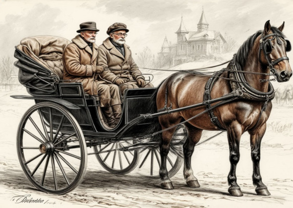 Выйдя из конторы, он крикнул: «Извозчик! Извозчик!», и незамедлительно подкатил крытый экипаж с возницей в подмятом цилиндре на голове. «Куда ехать, товарищ?». «А скажи, любезный, далеко ли биржа извозчиков?» «Почто вам биржа? Сам довезу куда надо!» «Ехать не близко, в N-ск, знаешь дорогу?» «А то, как же, ездил туда, и правда, далёко. Сколь денег положите?» «Рублей сто пойдёт?» «Добавить бы надо…» «А я тебя угощу на дорожку, годится?» «Н-у-у, как угостите..» «Не обижу, поехали!» И усевшись на мягкое сиденье сказал: « Дай-ка стаканчик, любезный, я тебя чуток согрею“, сказал предводитель. Возница быстро сообразил и сразу же отыскал граненый. Киса достал из саквояжа краденый коньяк, налил полстакана, подал подчерствевший уже пирожок с „мясай“. „На добрую дорогу!“, сказал тост, и сам отхлебнул из бутылки. Извозчик выпил, закусил, закурил папиросу и, обернувшись, сказал: „Душевный напиток, как ангел прошел вовнутрь, теперь ехать и теплей и веселей“ „Ну, так трогай!“ „Едем