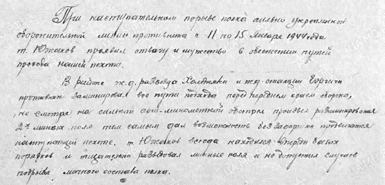 Изложение личного боевого подвига А. М. Южакова, на основании которого он был представлен к награждению орденом Красной Звезды.