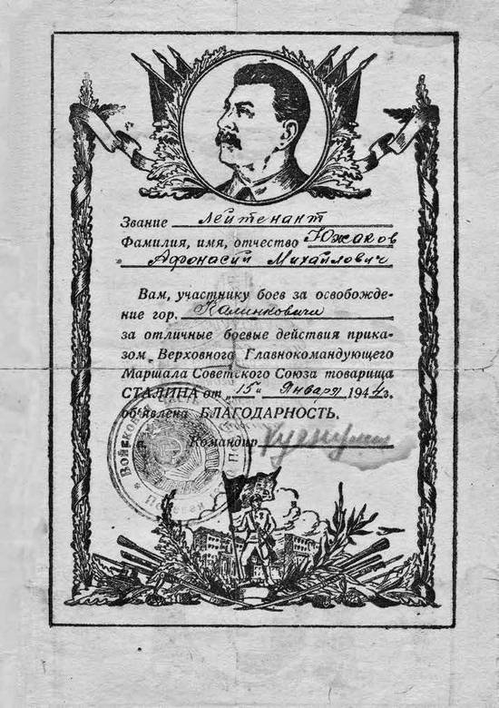 За взятие города Калинковичи многих моих соратников, а также и меня наградили. (Орден Красной Звезды, врученный Афанасию Михайловичу 25.01.1944 года – прим. ред.)