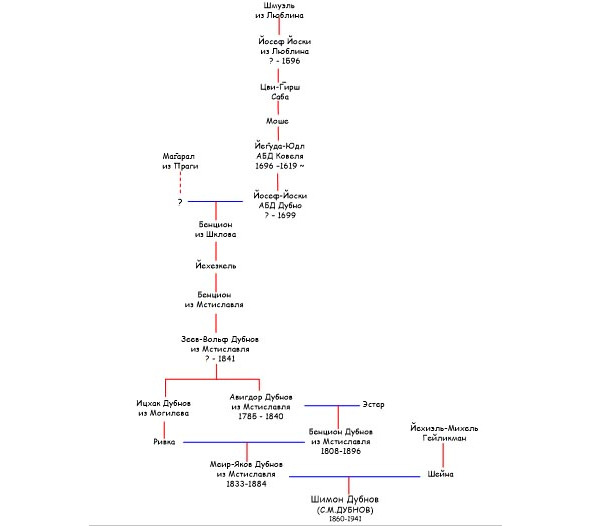 Родословная С. М. Дубнова по мужской линии, 13 поколений, представлена на следующей схеме: