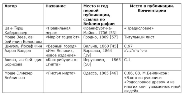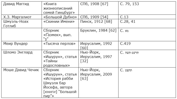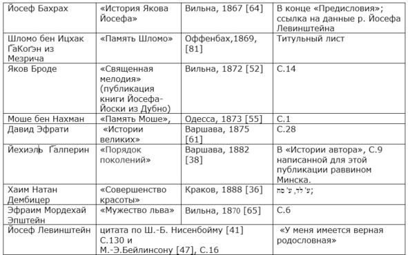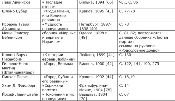 4. М.-Э. Бейлинсон в «Але адас» («Листья мирта», 1865), Д. Эфрати в «Толдот анше шем» («Истории великих», 1875) и Ш.-Б. Нисенбойм в «Лекорот г̄айег̄удим беЛюблин» («К истории евреев в Люблине», 1899)75 говорят о неких имеющихся в их распоряжении родословных росписях, но о каких (о каком) ― авторы не указывают. Ш. Энглард пишет: