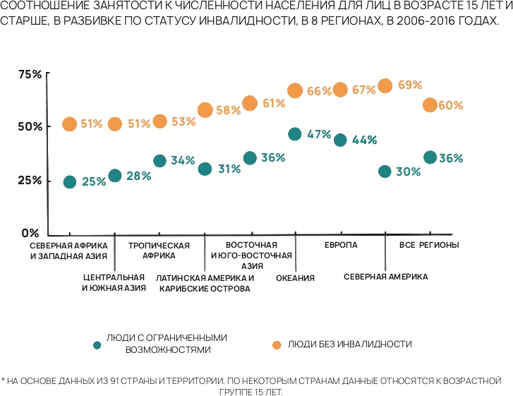 В мире, согласно данным ООН[25], в 2006–2016 гг. уровень занятости лиц с инвалидностью составлял в среднем 36 % против 60 % среди людей без инвалидности (рисунок 3).