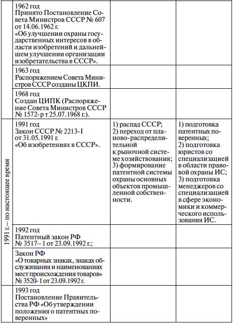 В табл. 1, составленной авторами монографии, представлены периоды формирования системы образования в сфере ИС с учетом социально-экономического и политического положения в стране и действующего законодательства в период с 60-х годов прошлого века по настоящее время.