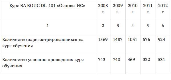В табл. 5, составленной авторами монографии на основании ежегодных отчетов о деятельности Роспатента, представлены сведения о количестве зарегистрировавшихся и прошедших обучение на курсах ВА ВОИС DL-101 «Основы ИС».