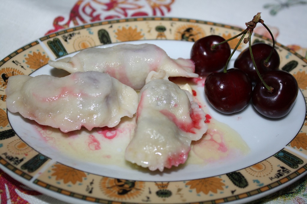 350 гр картофеля, 40 гр твердого сыра, 150 гр муки, 1 желток куриного яйца, по 1 столовой ложке растительного и сливочного масла, по 2 столовые ложки сметаны и зеленых овощей, по щепотке сушеного тимьяна, перца чили, куркумы и соли. Для гарнира – отварные креветки, вишни без косточек, клюква