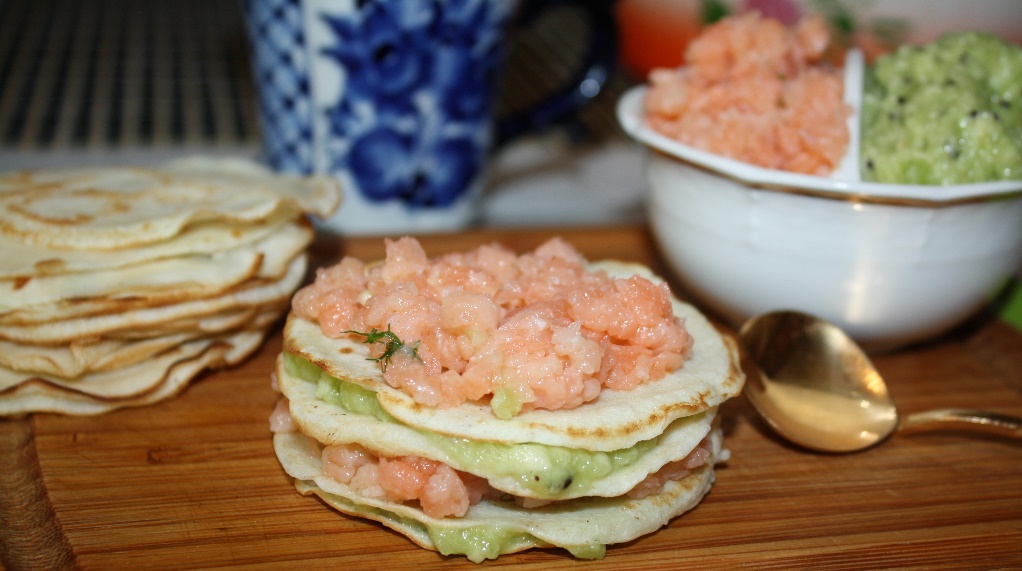 Блинчики послойно смазать разными начинками или подать отдельно: блинчики плюс начинки.