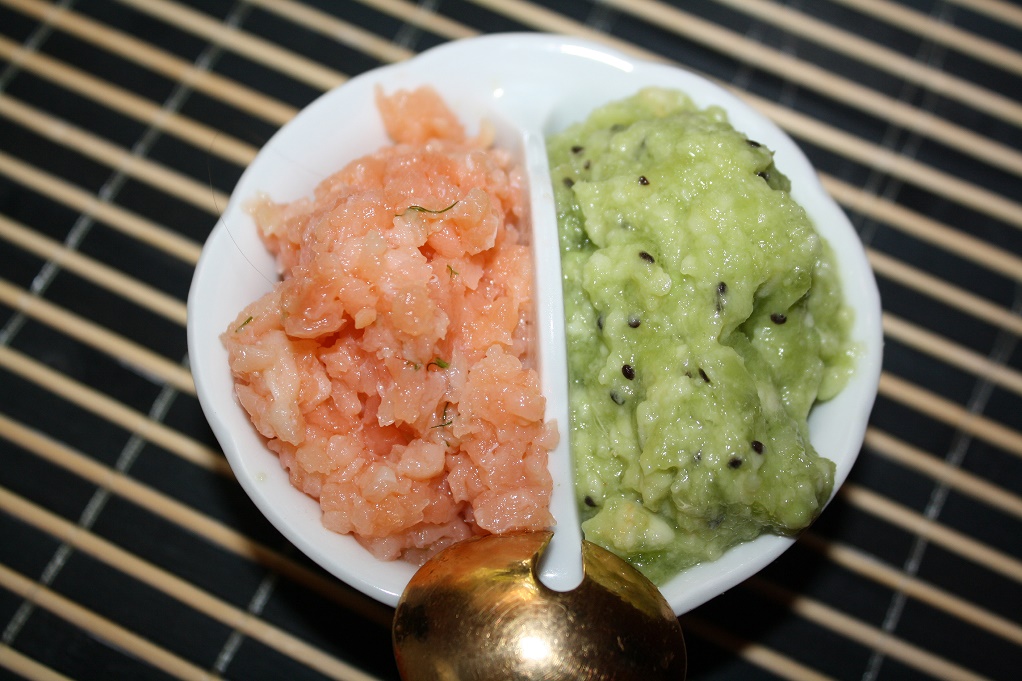 По 200 гр авокадо и киви, 1 столовая ложка сока лимона.