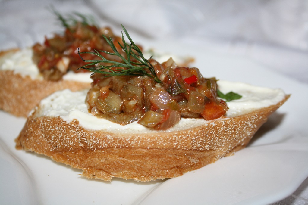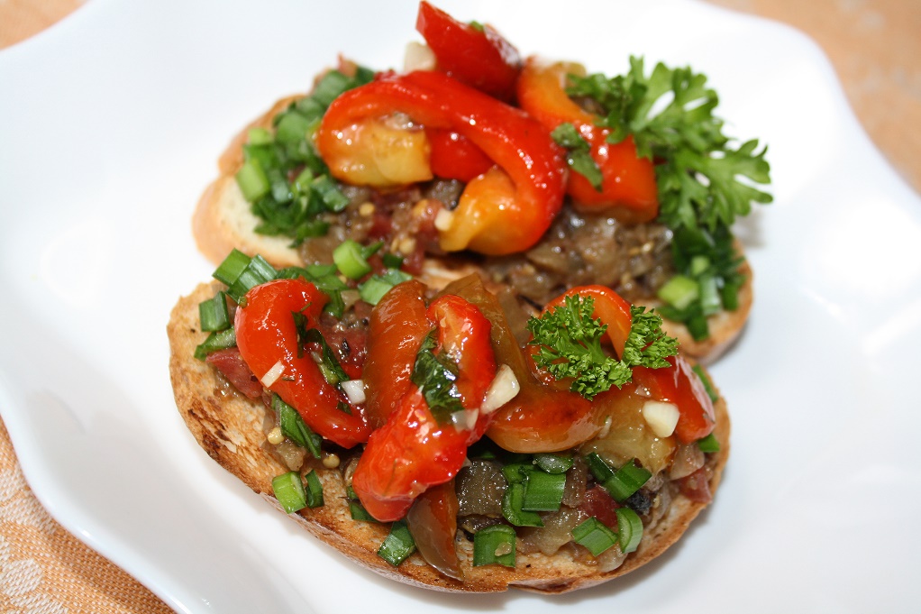 Для бутербродов: 50-70 гр белого хлеба, 2 столовые ложки икры из баклажанов, ½ крупного красного перца, 1 столовая ложка рубленой зелени лука, 2-3 веточки зелени петрушки, 1 зубчик чеснока.