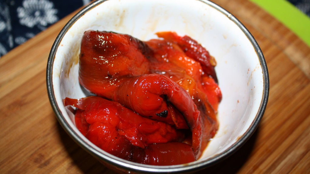 Перец запечь в гриле, очистить от кожи и семян. Перец нарезать широкими полосками, посыпать рубленым чесноком, полить смесью уксуса, вина и растительного масла, приправить солью, сахаром и перцем, перемешать. Перцы выдержать в холодильнике несколько часов.