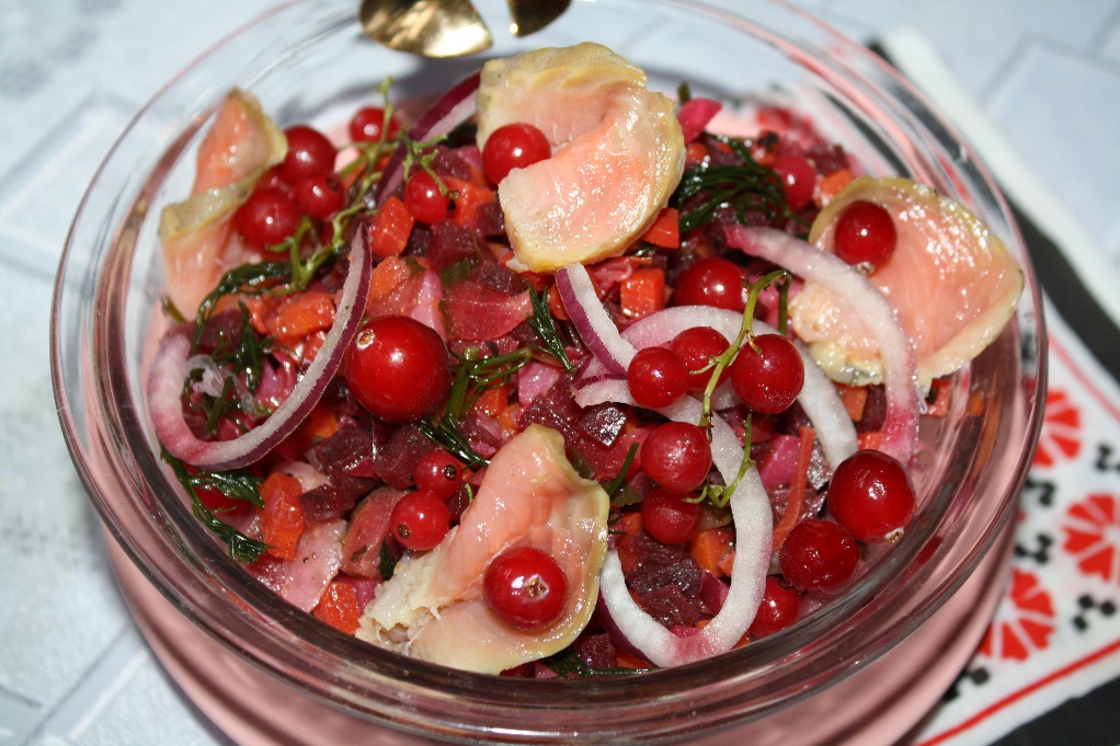 Сверху на винегрет положить кусочки рыбы и замороженные ягоды.