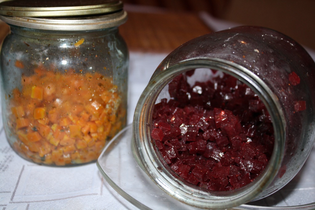 Свеклу и морковь очистить, мелко нарезать, сложить раздельно в стеклянные баночки подходящего размера.