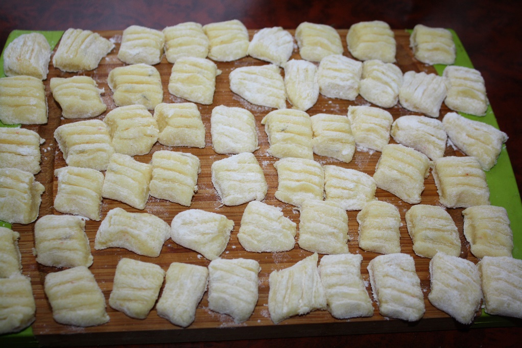 Каждый кусочек прижать вилкой до образования на поверхности полосок. Довести до кипения подсоленную воду, частями опустить галушки, варить после закипания воды 1-2 минуты, отцедить.