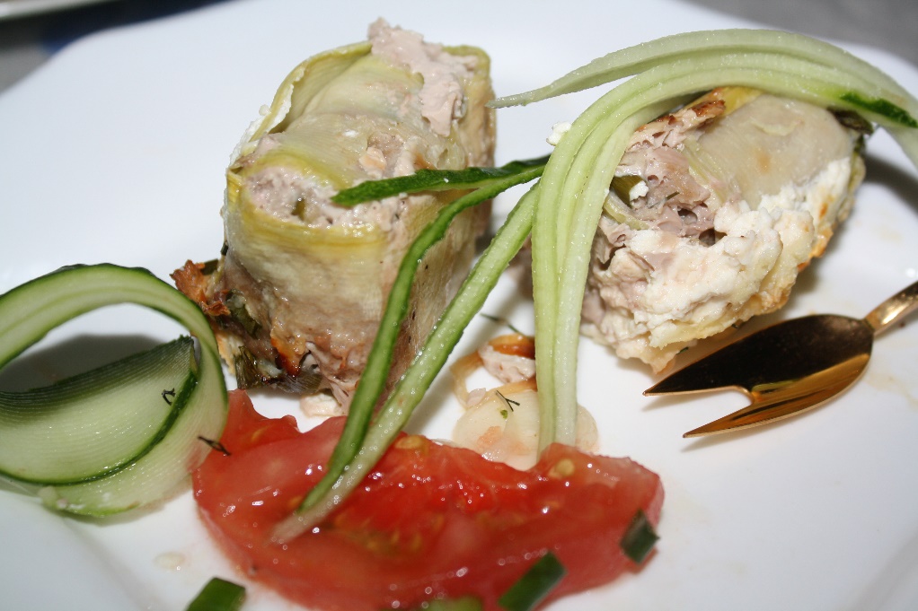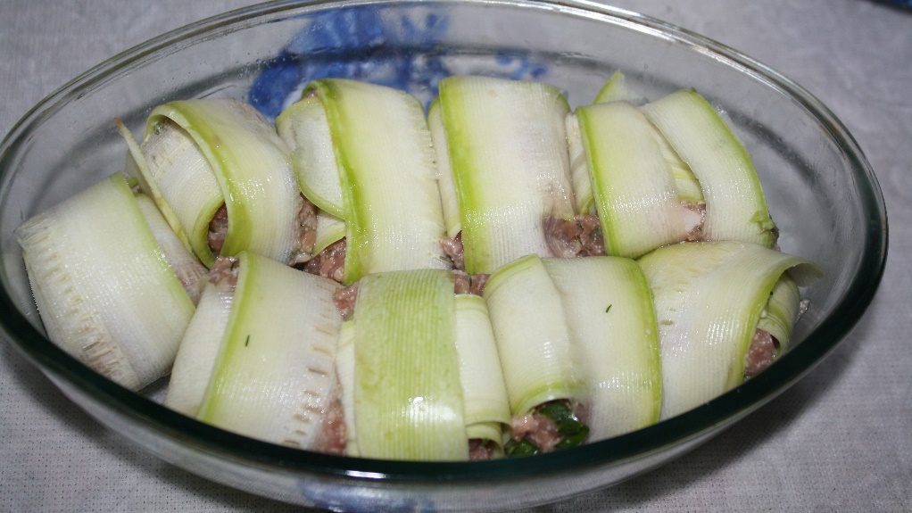 250 гр молодых кабачков, 1 яйцо, 1-2 столовые ложки простокваши, около 200 гр муки, соль, перец по вкусу, около 50 мл растительного масла, 0,3 чайной ложки соды, погашенной 1 чайной ложкой светлого винного уксуса. Для начинки: 100-150 гр фарша из телятины с луком и чесноком, 100 гр помидоров, по 1 столовой ложке тертого сыра, кетчупа, растительного масла и рубленого лука, 100 мл говяжьего бульона, соль, пряности по вкусу.