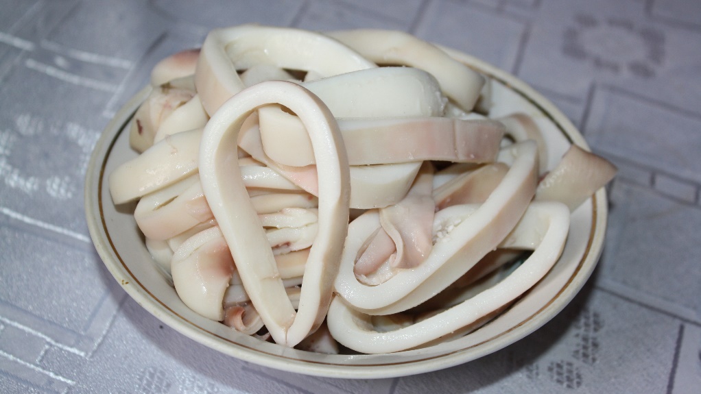 Кальмары отцедить, тщательно очистить с тушек остатки пленок, нарезать кусочками или кольцами.