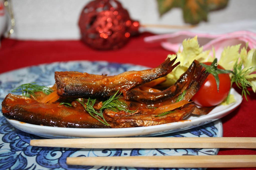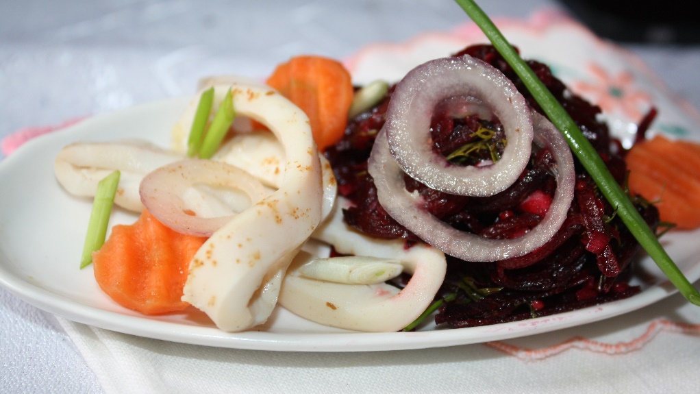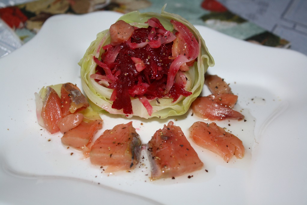 200 гр отварной свеклы, 200 гр капусты (маленький кочан), 100 гр репчатого лука, 3 столовые ложки растительного масла, 150 гр соленой красной рыбы (на снимке голец), 3 зубчика чеснока, соль, перец по вкусу.