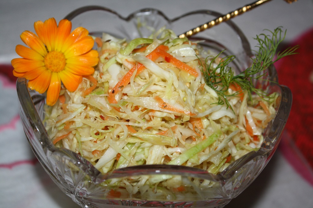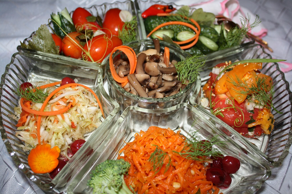 – Капусты, помидоров целых и резаных, малосольных огурцов, моркови, лесных маринованных грибов (опята или другие).
