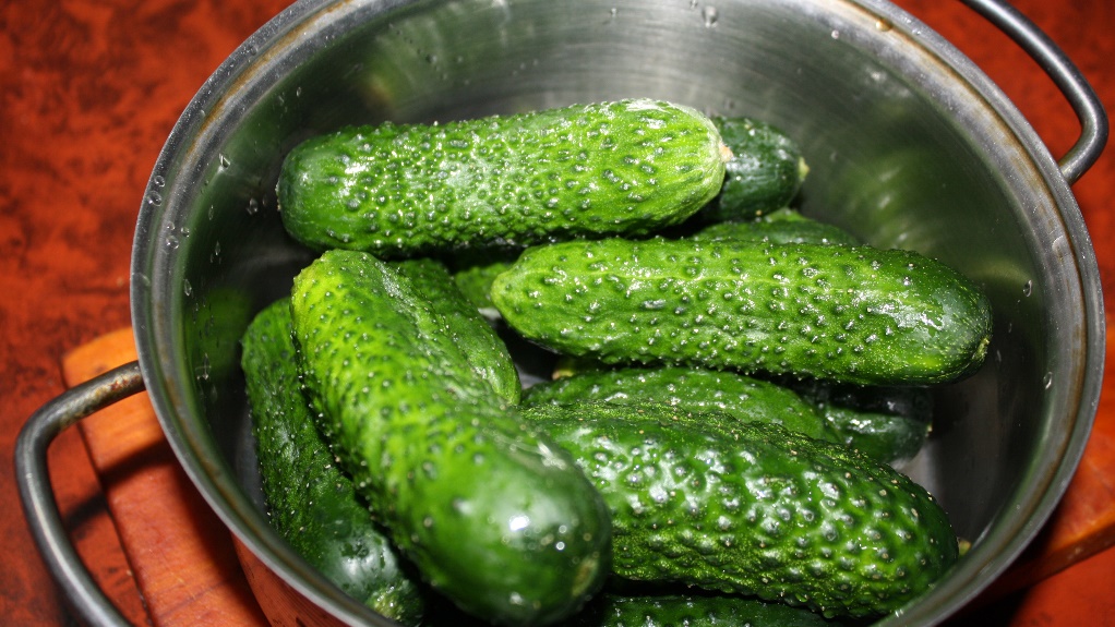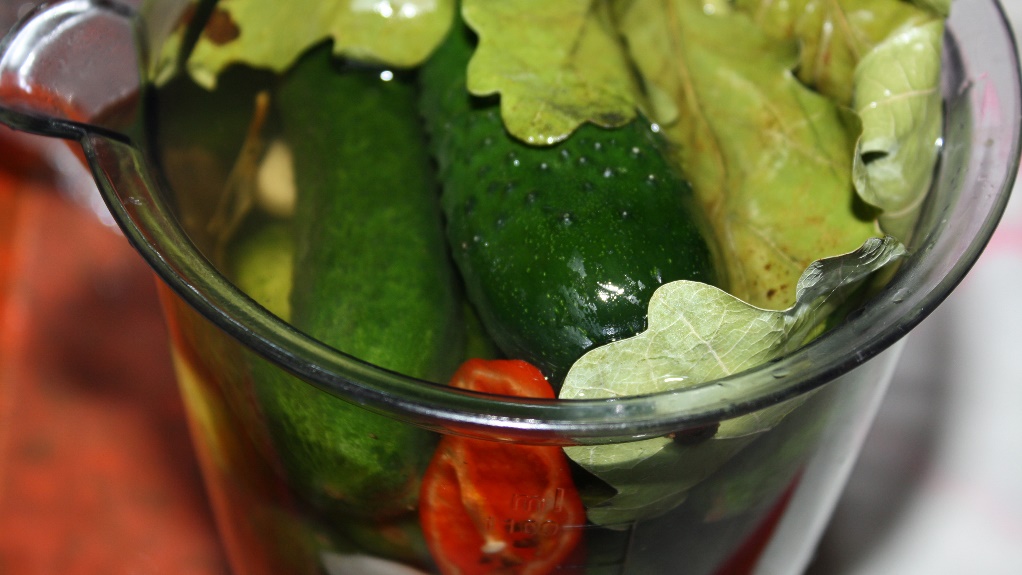 1 кг молодых, мелких огурцов, по 3-4 сушеных листьев вишни, черной смородины, дуба, укропа, 1 чайная ложка зерен горчицы, по 2-3 шт перца, гвоздики, 2-3 зубчика чеснока, кусочек перца чили, 700 мл воды, по 1 столовой ложке соли, сахара,