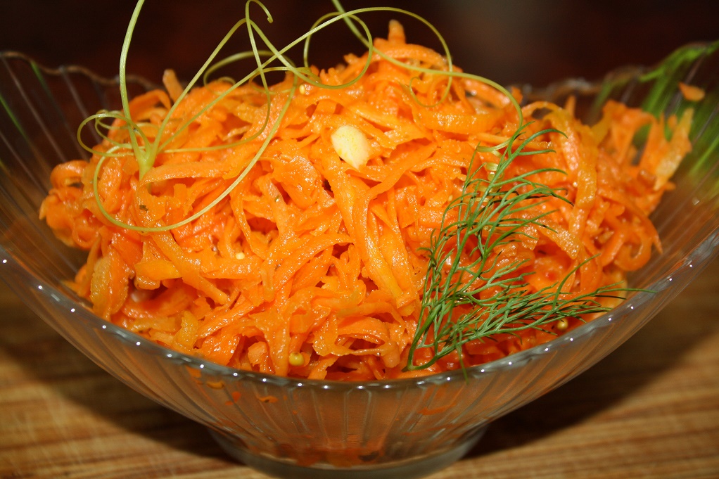Морковь очистить, натереть тонкой стружкой. Морковь переложить в засолочную емкость, добавить пряности, рубленый чеснок, горчицу, смесь растительного масла и уксуса, соль и сахар.