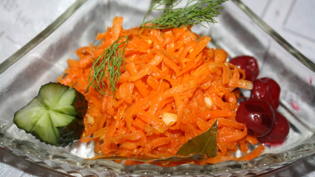700 гр моркови, 2 лавровых листика, 4 зубчика чеснока, 1 чайная ложка зерен горчицы, по 3-4 штуки зерен перца горького и душистого, гвоздика, по 3 столовые ложки растительного масла и яблочного уксуса, по 1 чайной ложке сахара и соли.