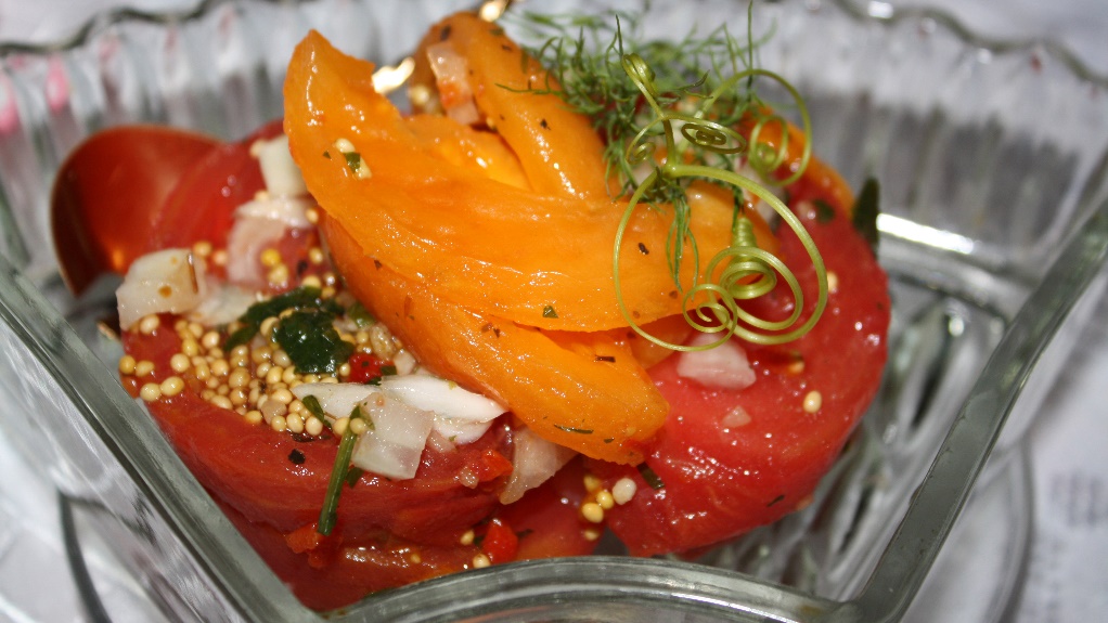 Помидор на 2-3 минуты залить кипящей водой, остудить в холодной воде, очистить от кожи. Помидор нарезать небольшими кусочками.