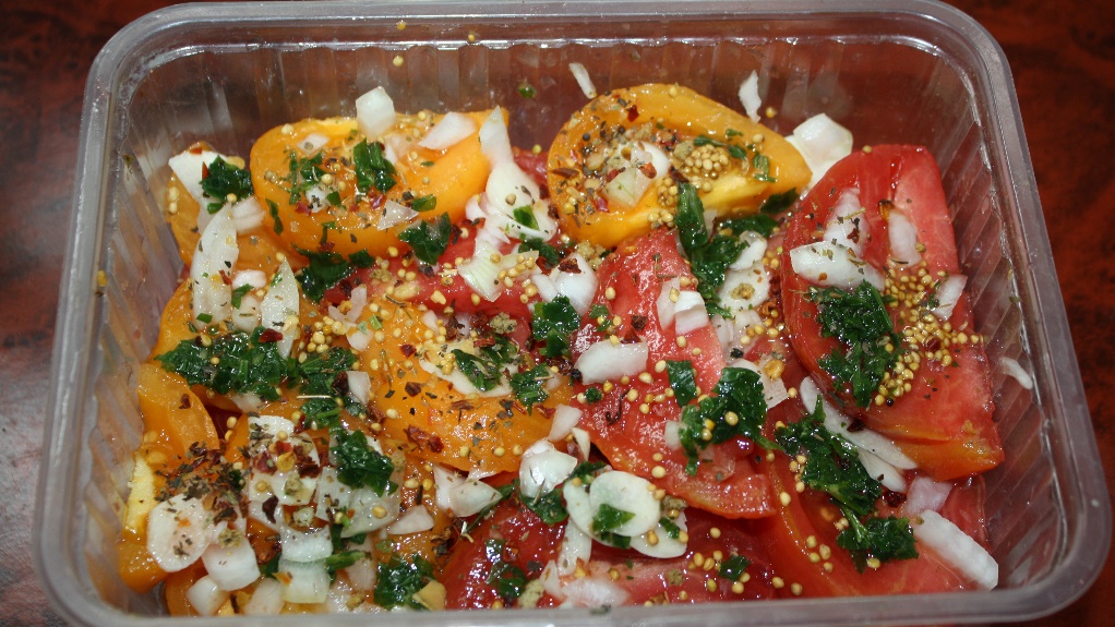 Ломтики помидоров слоями уложить в емкость для засола, каждый слой посыпать луком, чесноком, пряностями и полить маринадом (растительное масло, уксус и зелень),