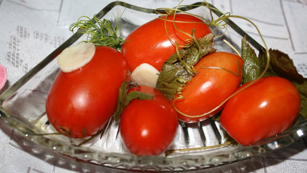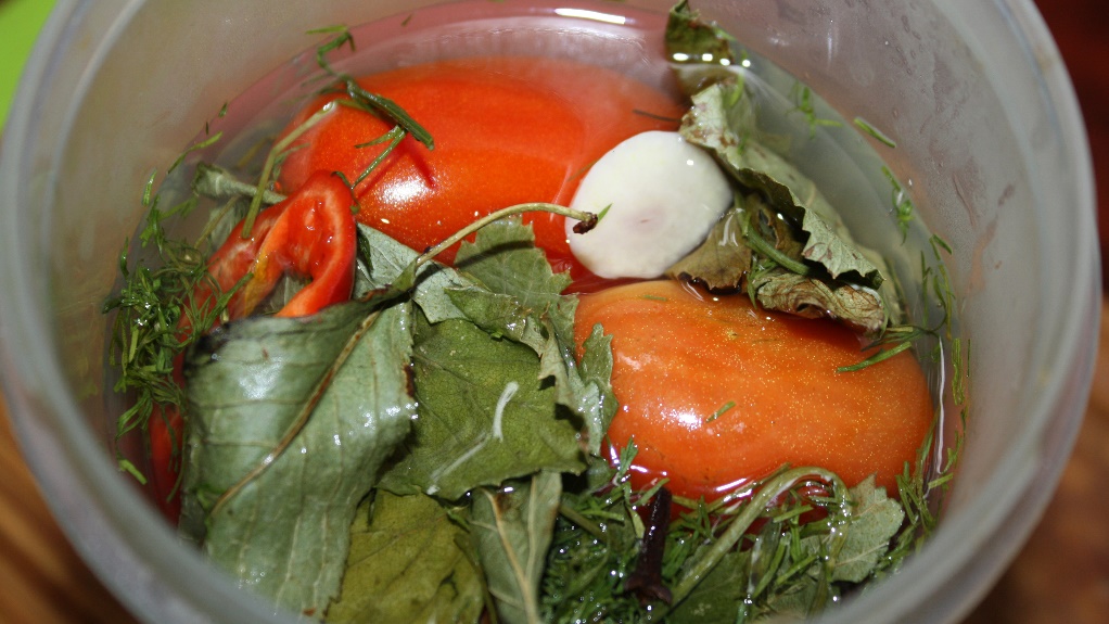 350 гр помидоров, 2-3 зубчика чеснока, сушеные листья черной смородины, вишни и дуба, по 1-2 шт гвоздики и черного перца, ломтик перца чили, по 1 чайной ложке сахара, соли и яблочного уксуса, 300 мл воды.