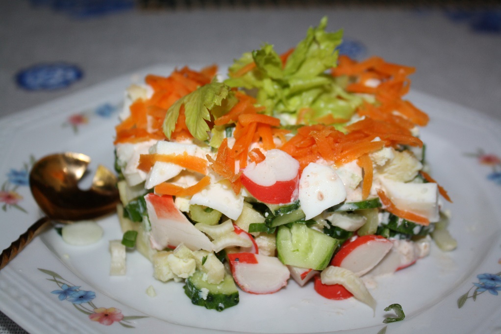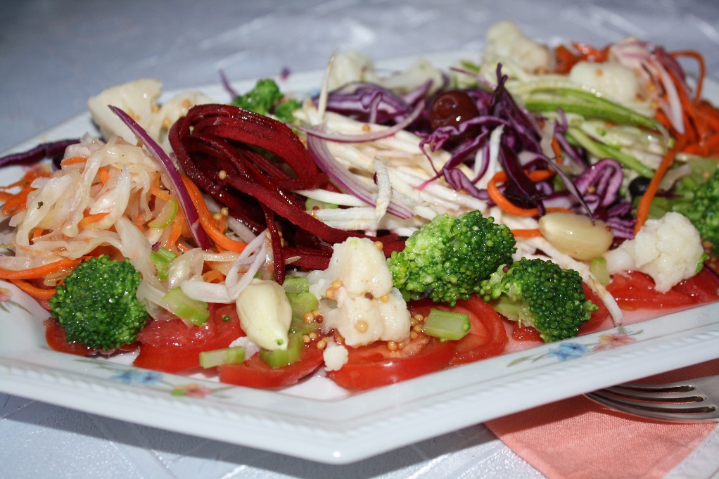 В салатах ингредиенты тонко нарезаны и смешаны. Приправляют салаты майонезом (лучше домашнего приготовления) или соусами с использованием растительных масел.