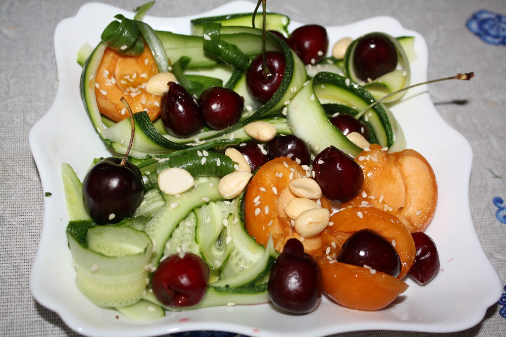 По 100 гр молодого кабачка, огурца, абрикосов и черешен, 2 столовые ложки оливкового масла, стебель зеленого лука, по 1 чайной ложке винного уксуса и меда, 0,5 чайной ложки семян кунжута, 1 столовая ложка миндаля, соль, пряности по вкусу.