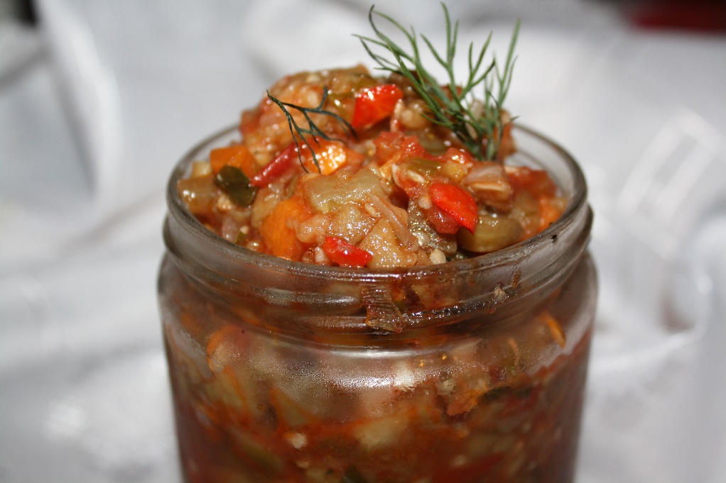 400 гр баклажанов, 250 гр помидоров, 3-4 зубчика чеснока, 3-4 столовые ложки растительного масла, по 1 столовой ложке яблочного уксуса, водки, рубленой зелени укропа, кусочек (1-2 см) мелко рубленого острого перца, по 15 гр репчатого лука и моркови, соль, пряности (молотые имбирь, зерна горчицы, майоран или др) по вкусу.