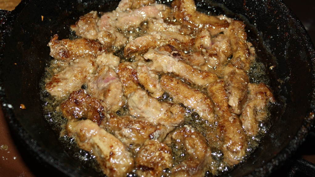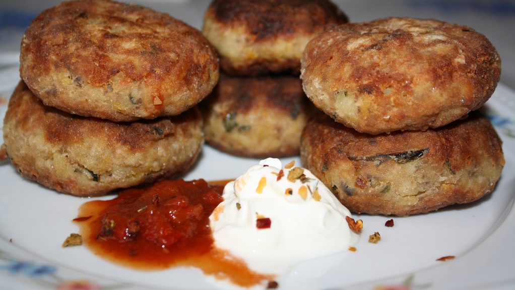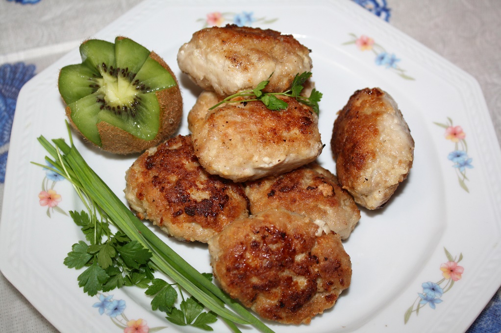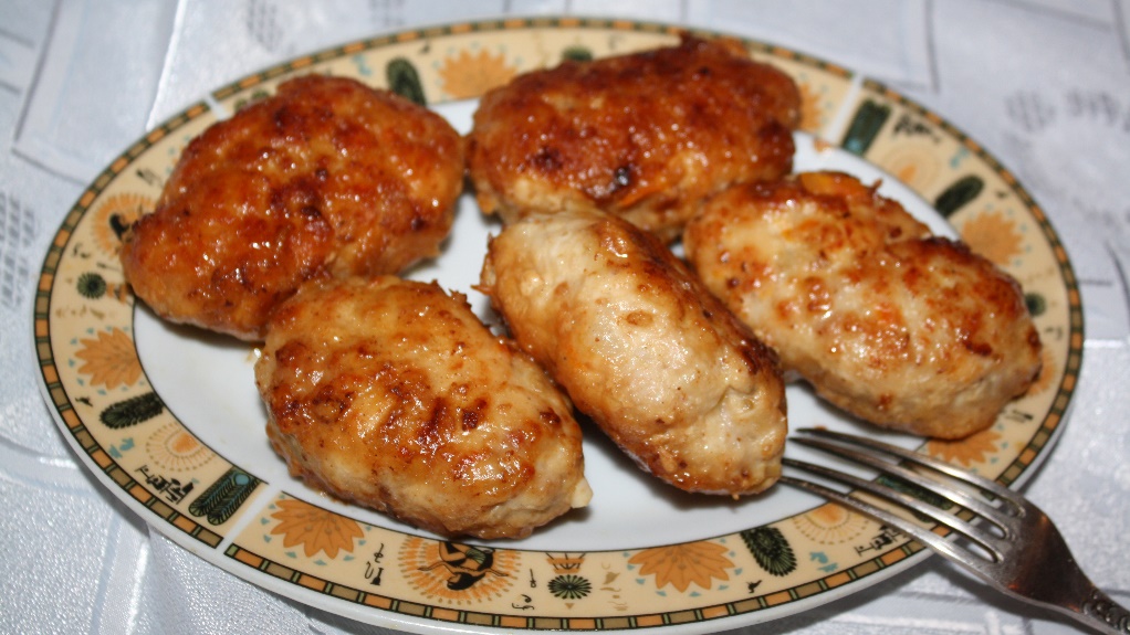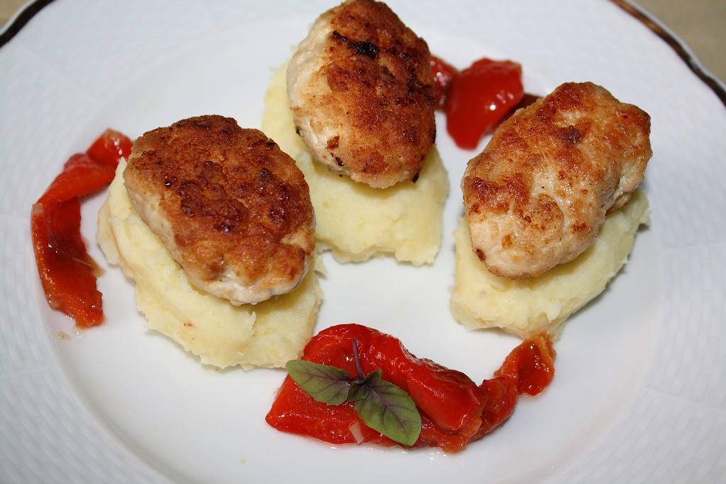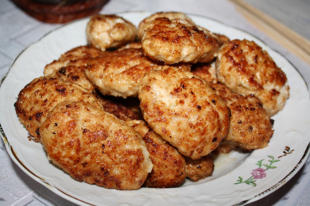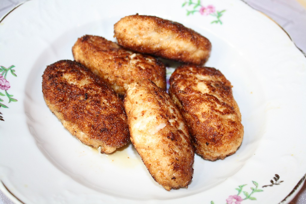 Жарить в большом количестве кипящего жира до зажаристой корочки. Подавать котлеты со сметаной и острым томатным кетчупом.