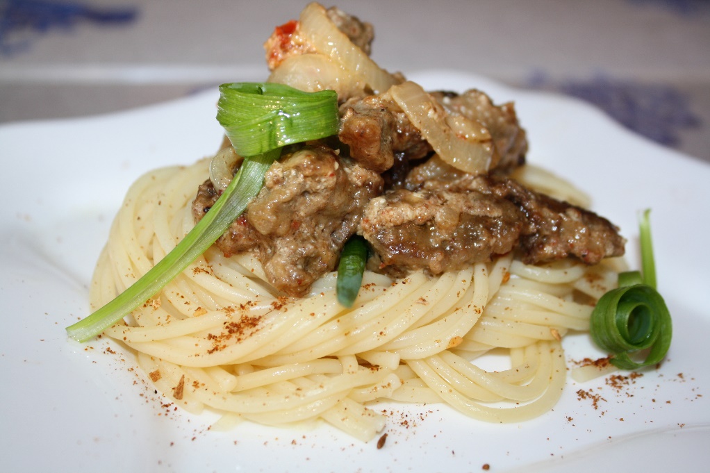 200 гр телячьей печенки, 150 мл молока, 30 гр репчатого лука, 1 зубчик чеснока, 1,5 столовой ложки муки, 1 столовая ложка жирной сметаны, 1 столовая ложка острого томатного соуса (лучше домашнего), 2-3 столовые ложки рафинированного подсолнечного масла или топленого сливочного масла, соль, пряности по вкусу.