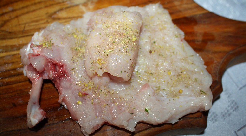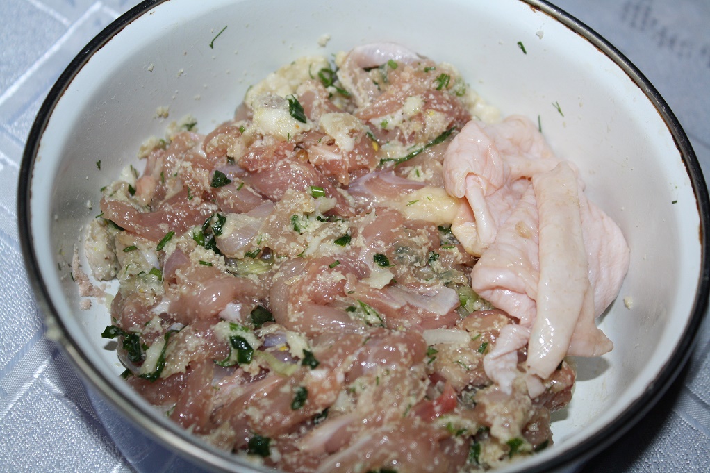 С бедер снять кожу, удалить кость. Филе бедер нарезать соломкой, посолить, приправить пряностями, добавить рубленую зелень (лук и укроп), полить коньяком, посыпать хлебными крошками, перемешать и оставить в прохладном месте на 15-20 минут.