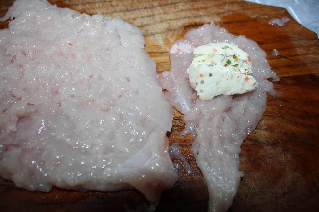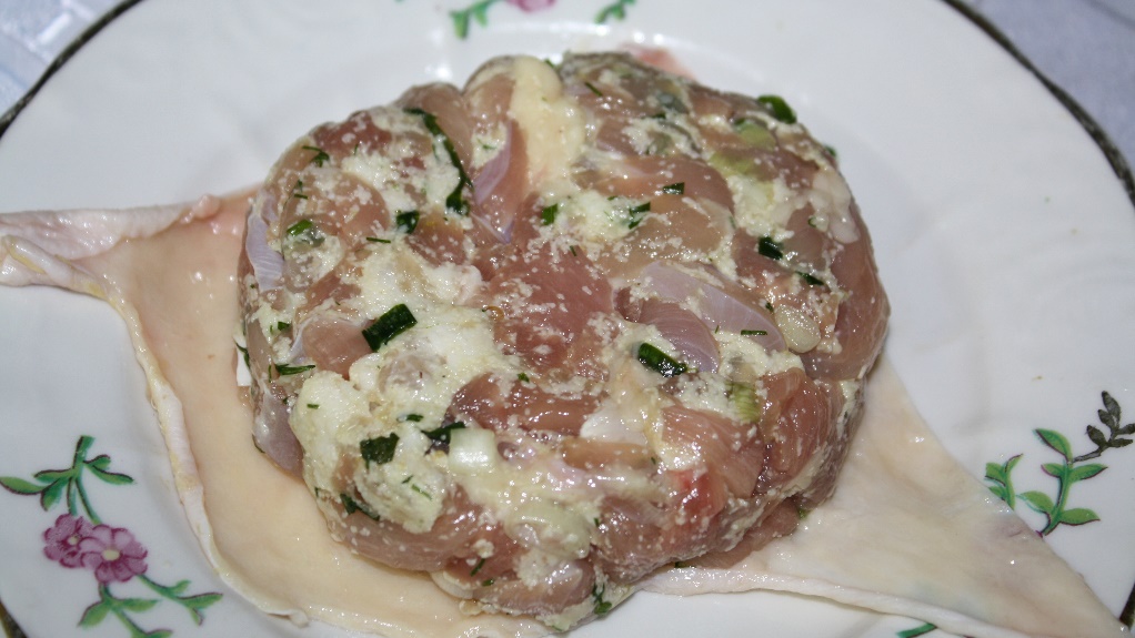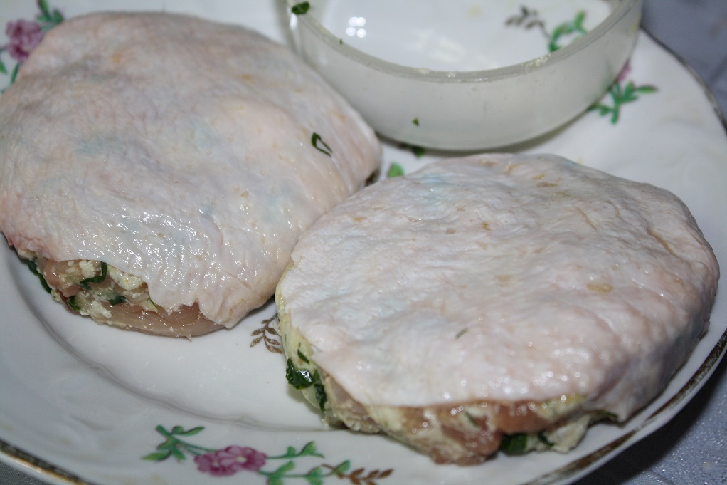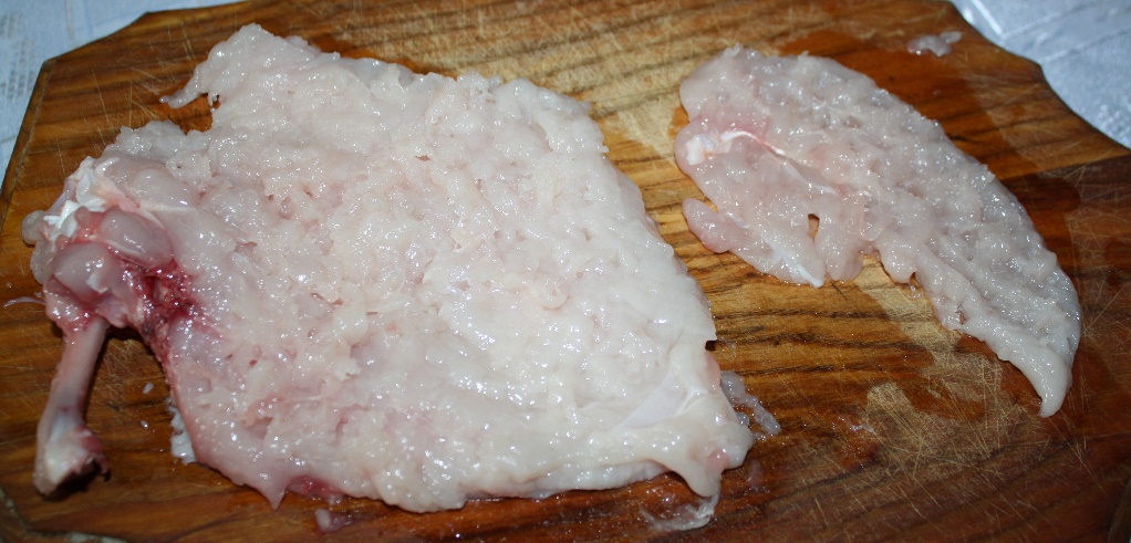 С грудки снять кожу, сохранить. Грудку разрезать по спинке пополам, разделить на два филе (наружное и внутреннее). Обе части филе раскатать в тонкую пластину или отбить