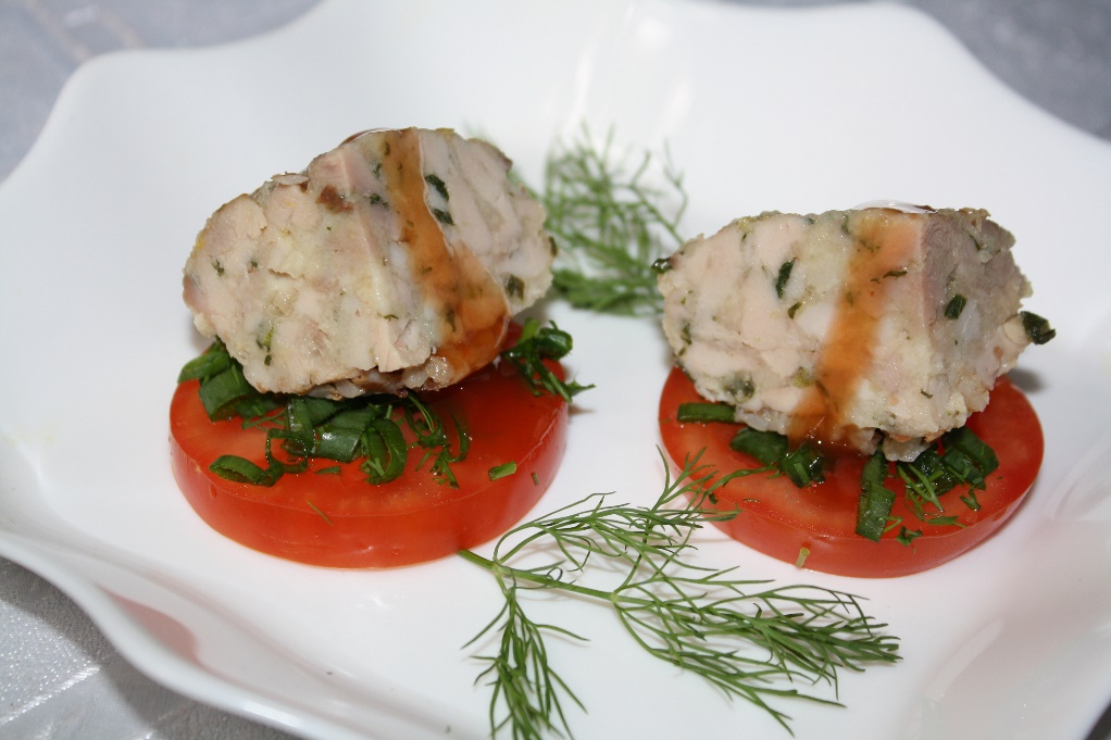 Мясо свернуть рулетом, завернуть в кожу, сколоть шпажками. Далее можно мясо завернуть в фольгу или марлю. Варить в пароварке 30-40 минут, остудить под прессом.