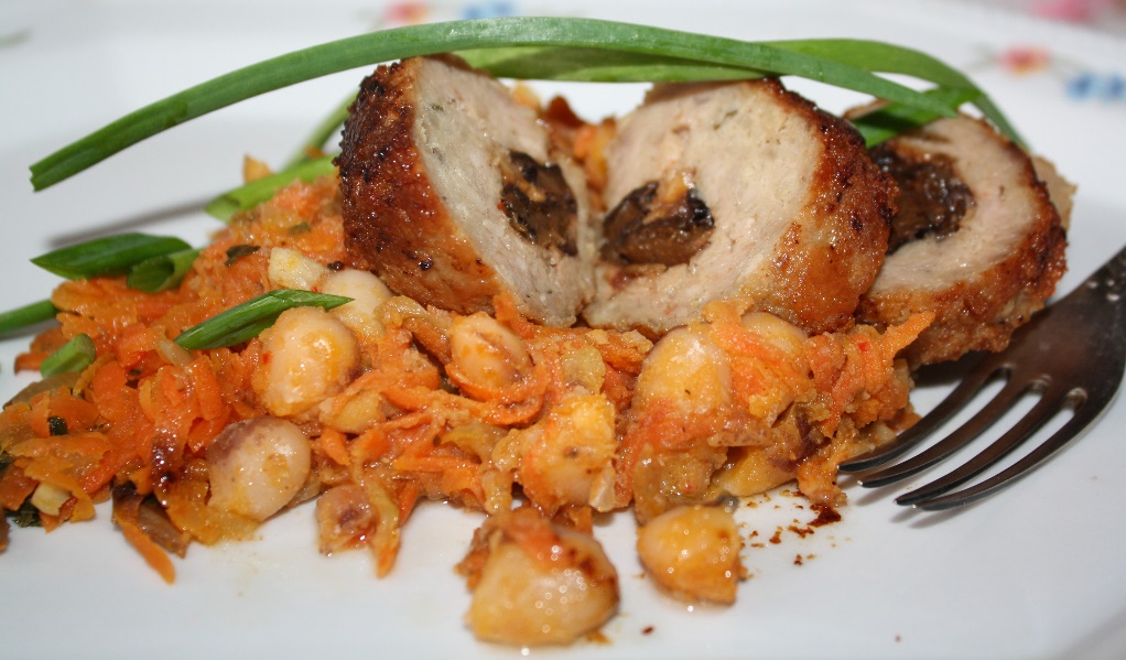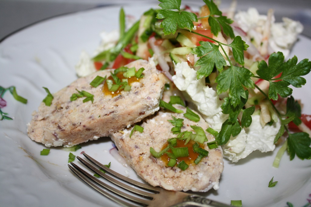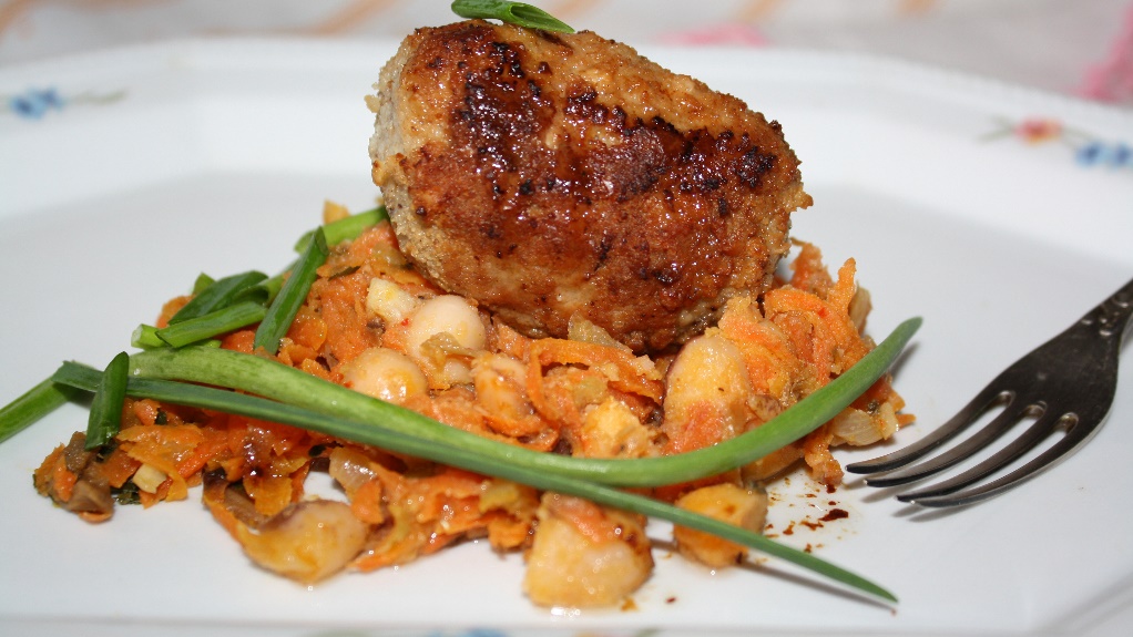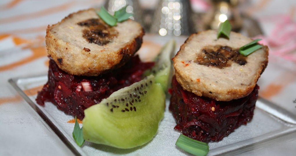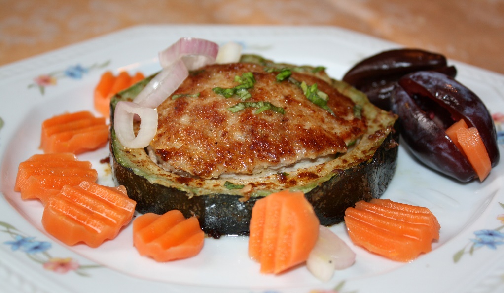 150 гр филе телятины, 100 гр (одно кольцо) очищенного от семян и мезги кабачка, 20 гр замороженного сливочного масла, 1 столовая ложка сливок, 20-30 гр репчатого лука, 1 зубчик чеснока, 2 столовые ложки белых хлебных крошек, щепотка сушеной зелени розмарина, перец чили, соль по вкусу, 2-3 столовые ложки растительного масла, около 100 гр маринованных овощей, 2-3 шт маринованного чернослива или абрикоса, несколько листиков свежей пряной зелени.
