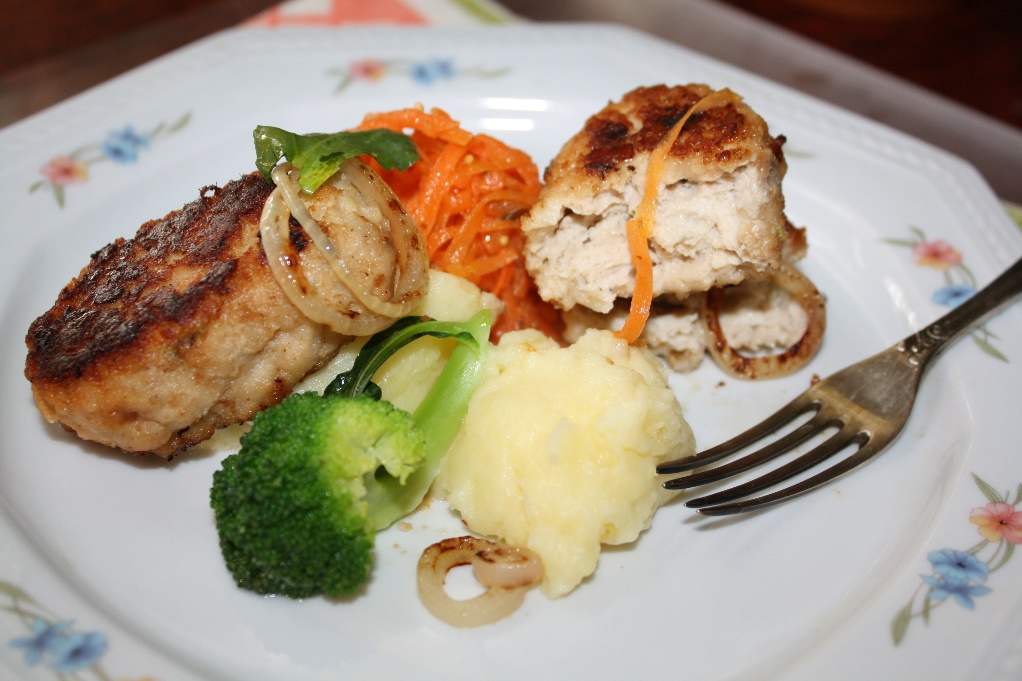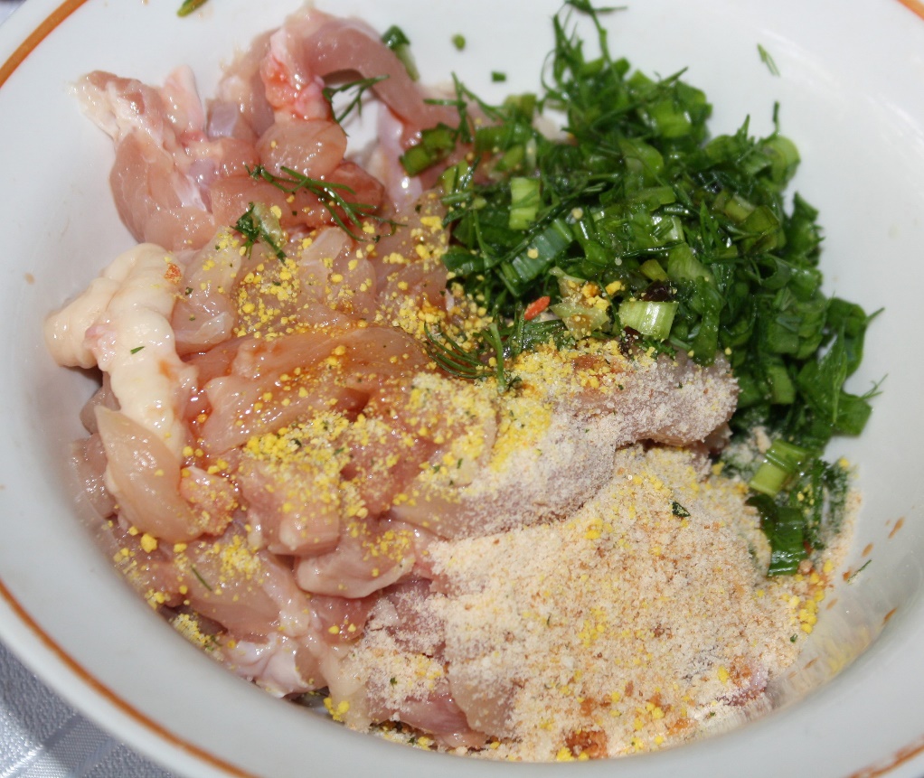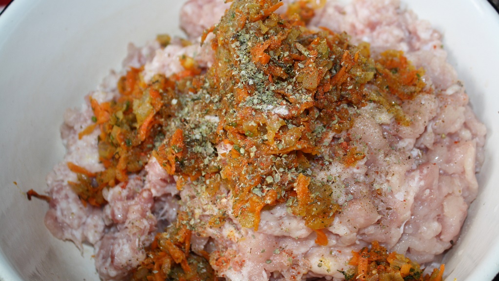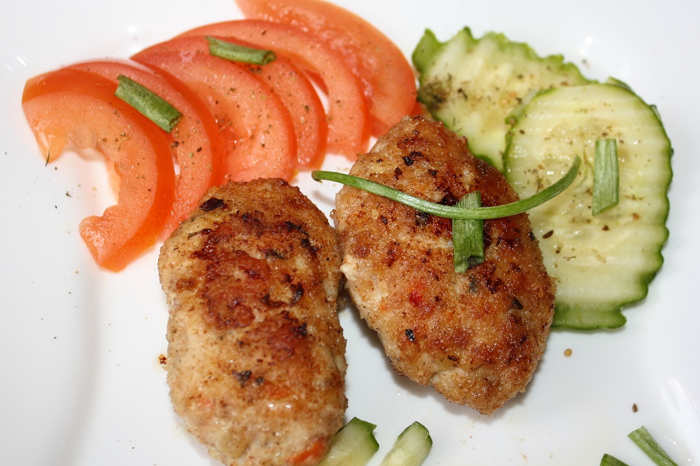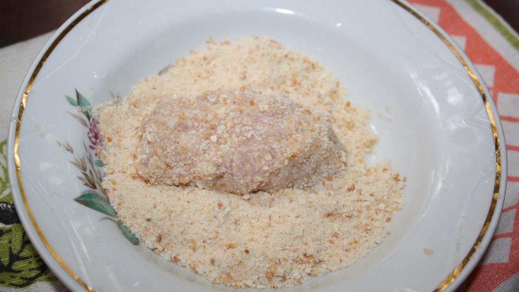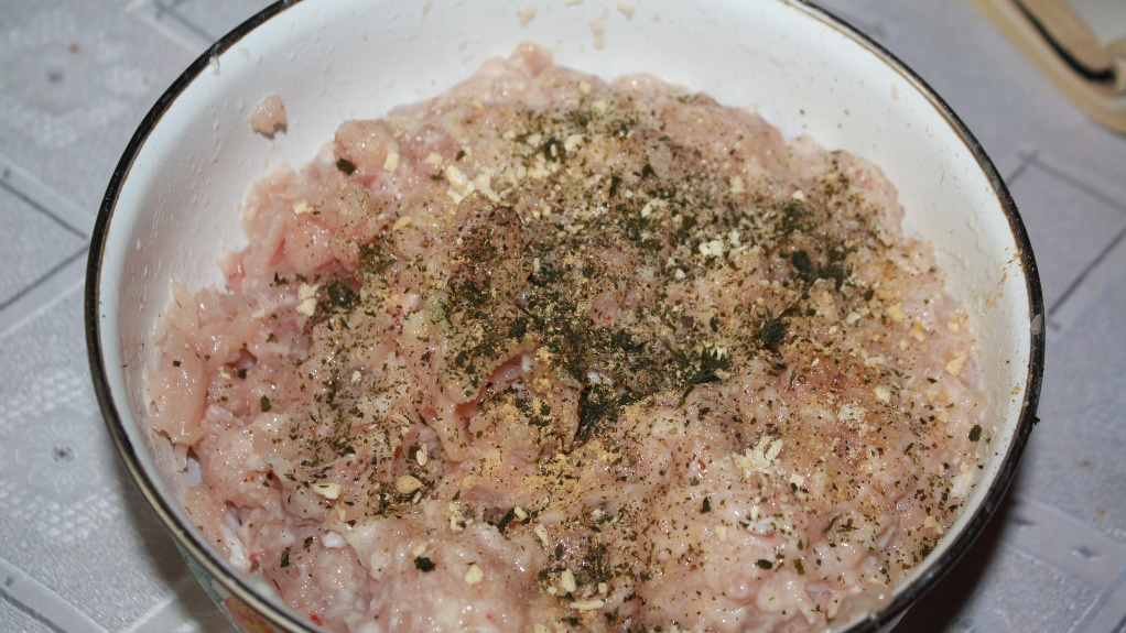 Фарш: около 1 кг смешанного фарша из индейки (курицы) и теленка, 100 мл жирных сливок, 2 зубчика чеснока, 100 гр сливочного масла, 2-3 ломтика сушеного батона без корок, по щепотке соли, перца чили, сладкого перца, зелени тимьяна, 50 гр репчатого лука, 2 яйца (одно из них для панировки), 5-7 столовых ложек домашних крошек из белого батона, 2 столовые ложки