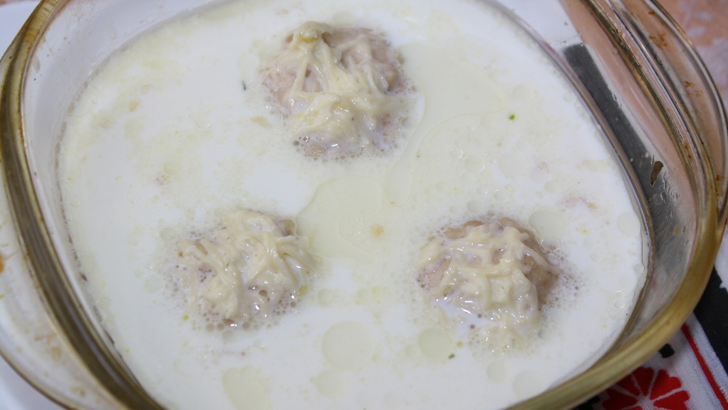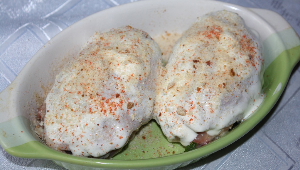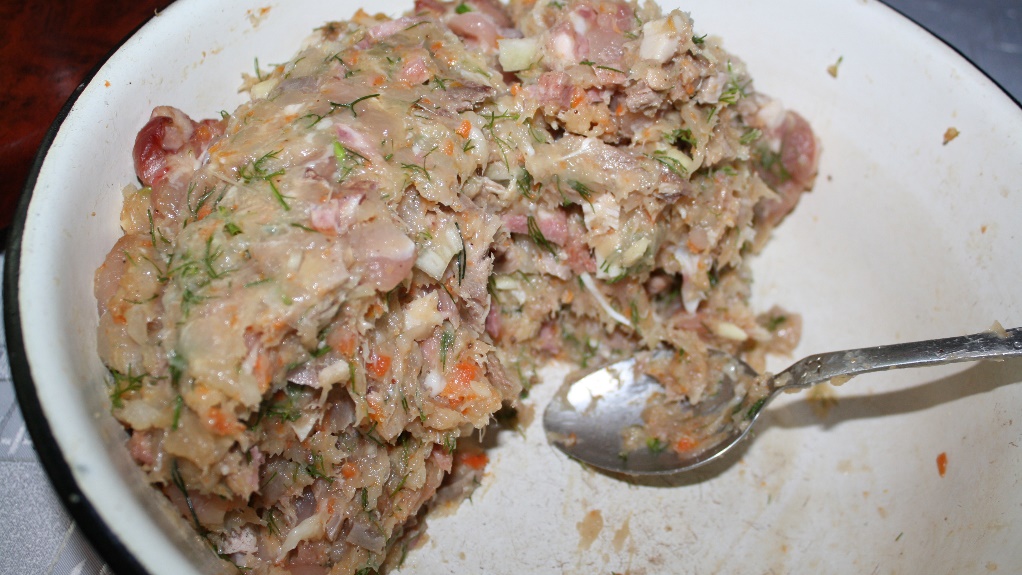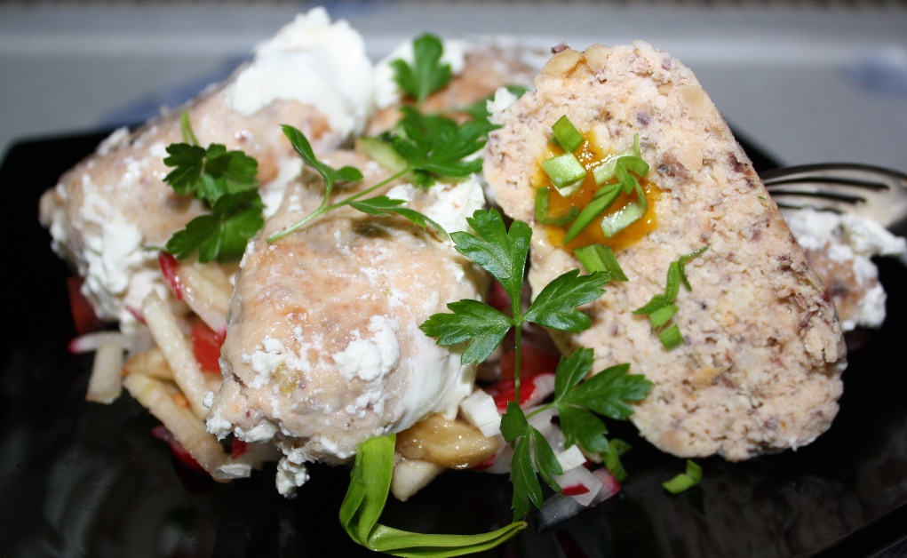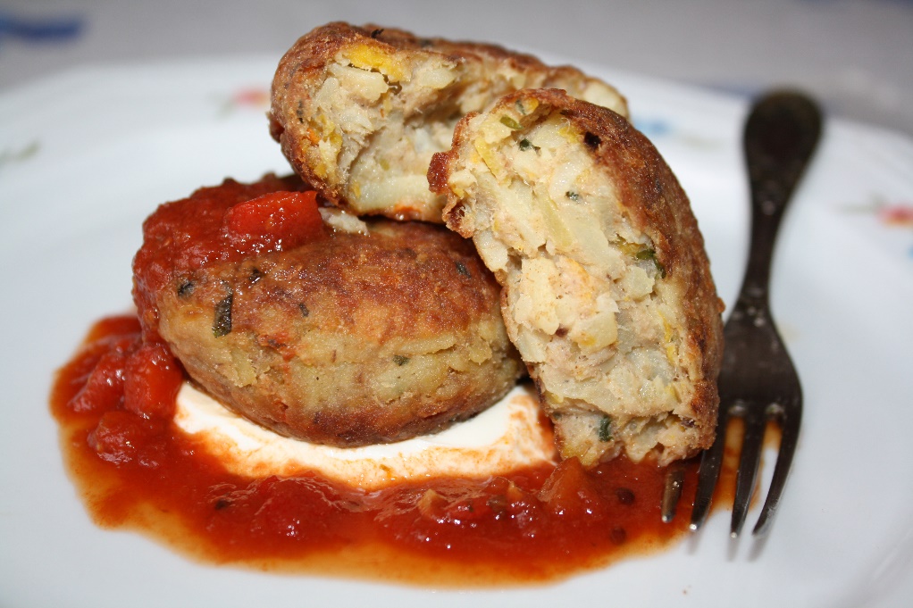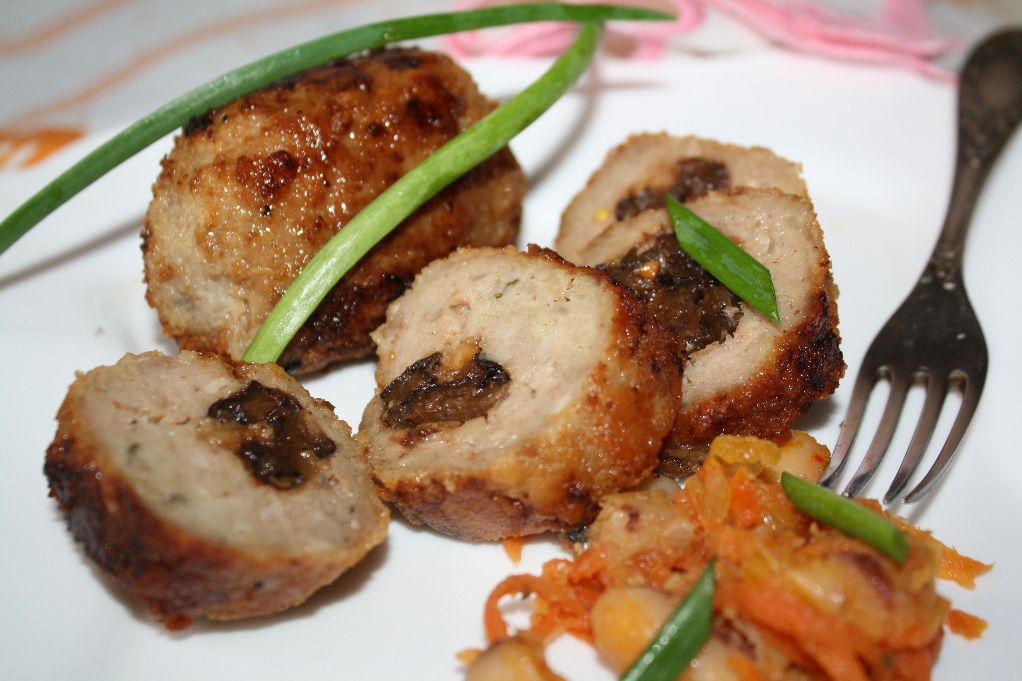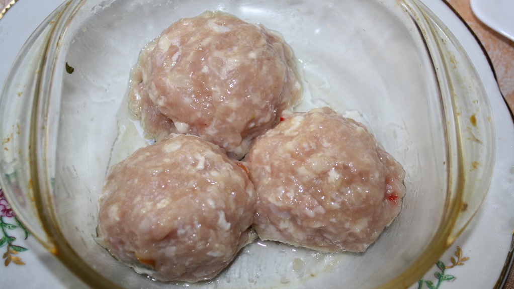 Фарш: около 1 кг смешанного фарша из индейки (курицы) и теленка, 100 мл жирных сливок, 2 зубчика чеснока, 100 гр сливочного масла, 2-3 ломтика сушеного батона без корок, по щепотке соли, перца чили, сладкого перца, зелени тимьяна, 50 гр репчатого лука, 2 яйца (одно из них для панировки), 5-7 столовых ложек домашних крошек из белого батона, 2 столовые ложки