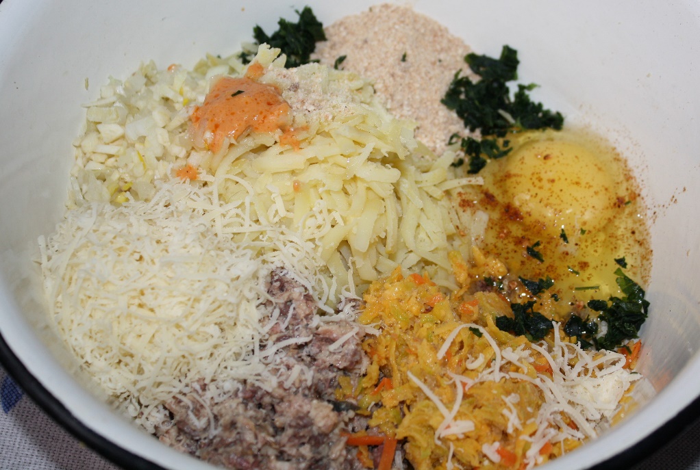 Сыр натереть. Лук, тыкву и морковь мелко порубить. Яйцо с солью взбить в пену. Рыбу отцедить, удалить кости, размять вилкой в крошку.