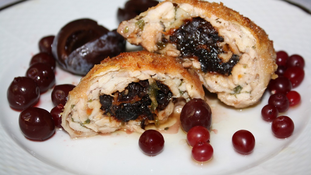 350-400 гр куриных бедер, 50-70 гр вяленого чернослива без косточек, 1 столовая ложка коньяка, 20-30 гр сыра, 10-20 гр сливочного масла, 1-2 стебля зеленого лука, 3-4 веточки укропа, 1 зубчик чеснока, 1 чайная ложка острого томатного соуса, 1-2 столовые ложки сметаны, 1 столовая ложка хлебных крошек, молотый имбирь, перец, соль по вкусу.