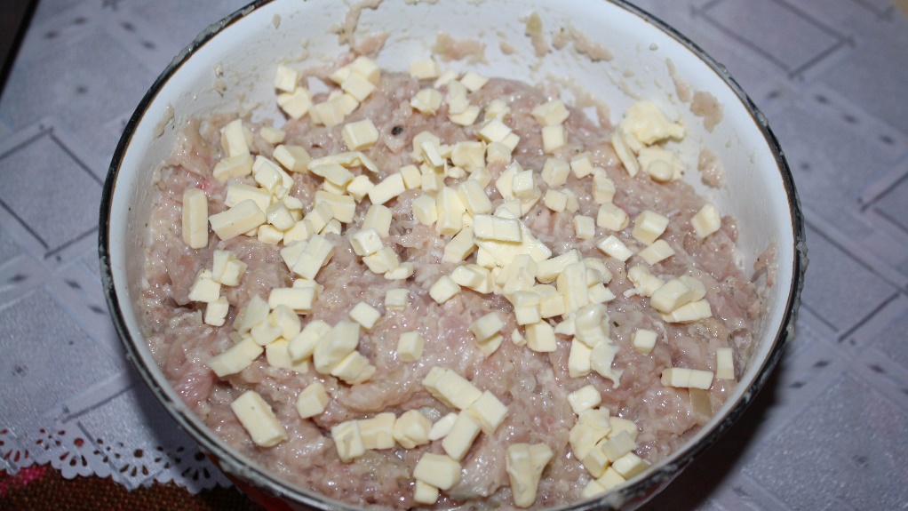 Сливочное масло нарезать кубиками, добавить в фарш. Фарш вымешать и отбить.