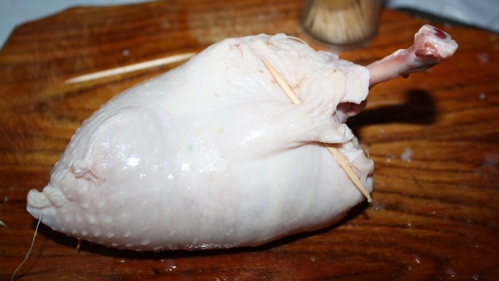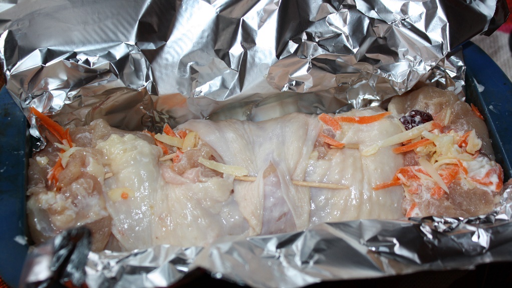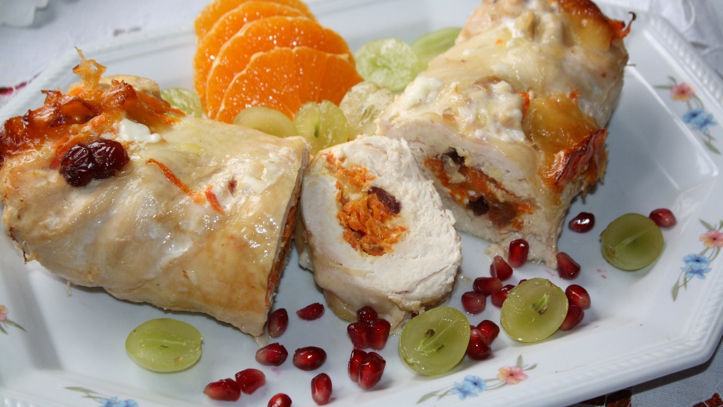 Грудку промыть, залить подкисленной соком лимона водой, оставить в прохладном месте на сутки. За это время воду несколько раз поменять. С грудки снять кожу, сохранить. Разделать грудку на филе. Мясо через пленку отбить в тонкий пласт. Сыр и морковь натереть на терке, чеснок мелко порубить. Изюм промыть, обсушить, сбрызнуть коньяком, оставить на 2-3 часа в прохладном месте.