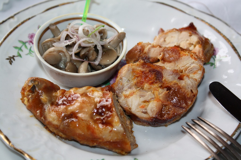 Ножки обмыть, обсушить, извлечь косточку (создать закрытый с одной стороны карман, для чего косточку возле сустава надрубить и ее часть около 1,5 см оставить). Внутри ножки мясо посолить и приправить перцем. Вешенки опустить в кипящую подсоленную и подкисленную воду, бланшировать 2-3 минуты, откинуть на сито, обсушить, нарезать соломкой.